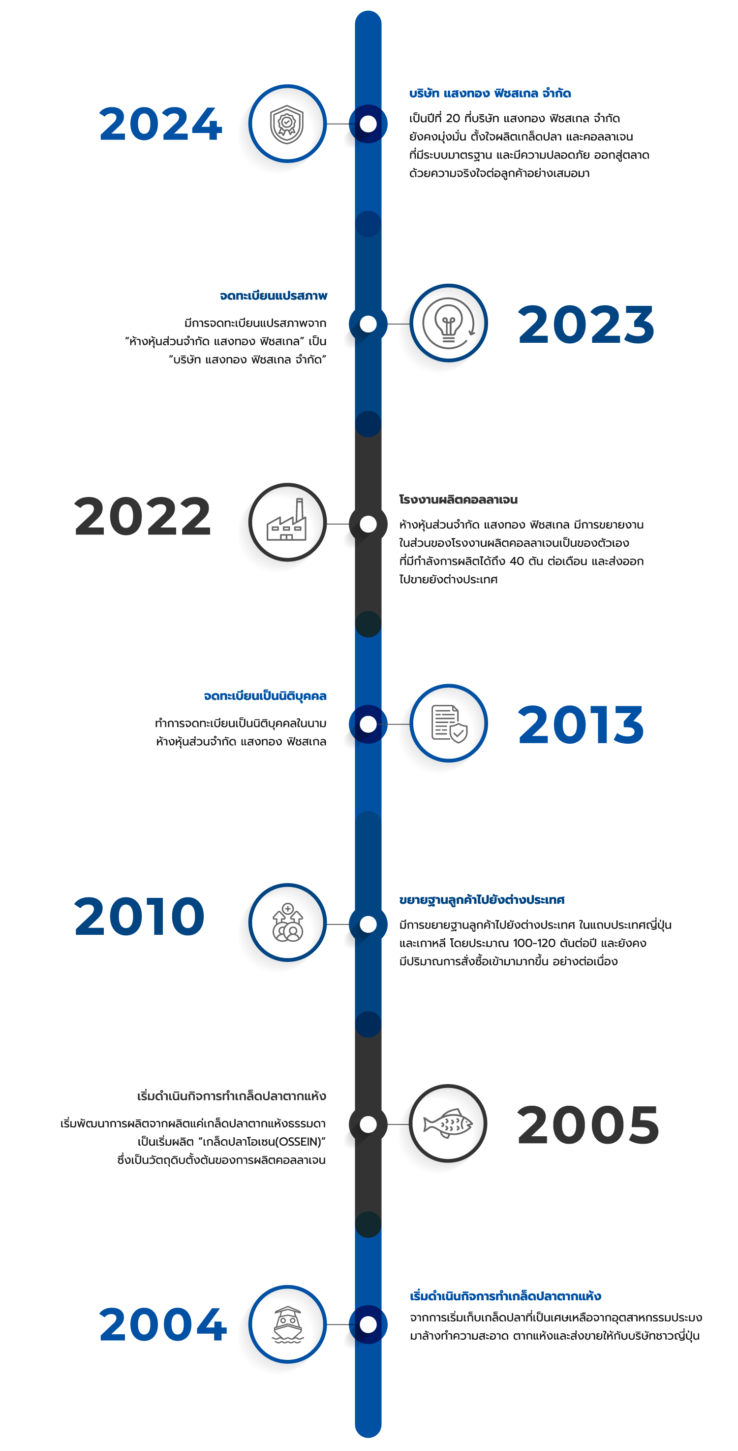 นับตั้งแต่ ค.ศ.2004 ซึ่งเป็นปีเริ่มต้นของการทำเกล็ดปลาตากแห้ง เกล็ดปลาโอเซน ซึ่งเป็นวัตถุดิบตั้งต้นของการนำไปสกัดเป็นคอลลาเจน จำหน่ายทั้งในประเทศไทยและส่งออกไปยังต่างประเทศ โดยเริ่มส่งออกไปยังประเทศญี่ปุ่นเป็นประเทศแรก และมีอัตราการเติบโตขึ้นอย่างต่อเนื่องตลอดจนถึงมีการเริ่มทำโรงงานผลิตคอลลาเจนเป็นของตัวเอง แม้จะเริ่มต้นจากโรงงานขนาดเล็ก แต่บริษัท แสงทอง ฟิชสเกล จำกัด ก็ถือว่าเป็นบริษัทที่มีความเชี่ยวชาญ ความชำนาญ ในการผลิตเกล็ดปลาโอเซนและคอลลาเจนที่มีคุณภาพตามระบบมาตรฐาน โดยมุ่งเน้นคำมั่นที่ว่า “ซื่อสัตย์ จริงใจ และส่งมอบสินค้าที่มีคุณภาพสู่มือลูกค้า เพื่อให้เกิดความพึงพอใจสูงสุด”