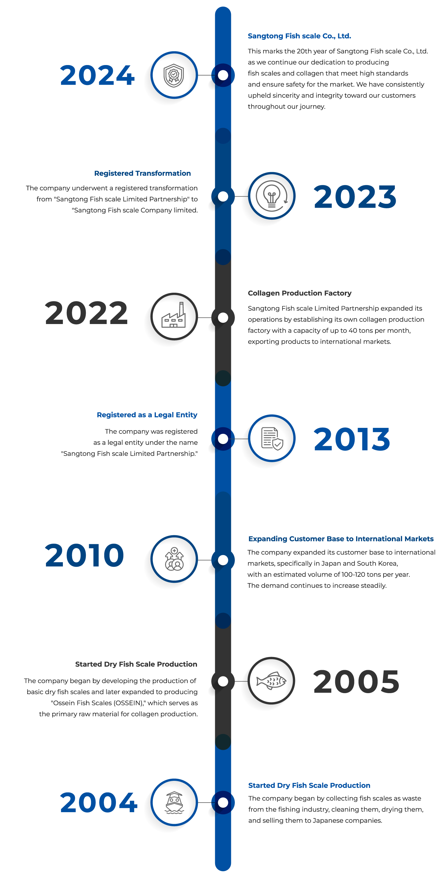 Since 2004, the year we began producing dry fish scales, ossein fish scales have served as the primary raw material for collagen extraction, supplied both domestically in Thailand and exported internationally. We started by exporting to Japan, the first country to receive our products, and experienced continuous growth. This led to the establishment of our own collagen production factory, which began as a small-scale operation. Sangtong Fish scale Co., Ltd. is a company with expertise and proficiency in producing high-quality ossein fish scales and collagen, adhering to standard systems. We are committed to the values of